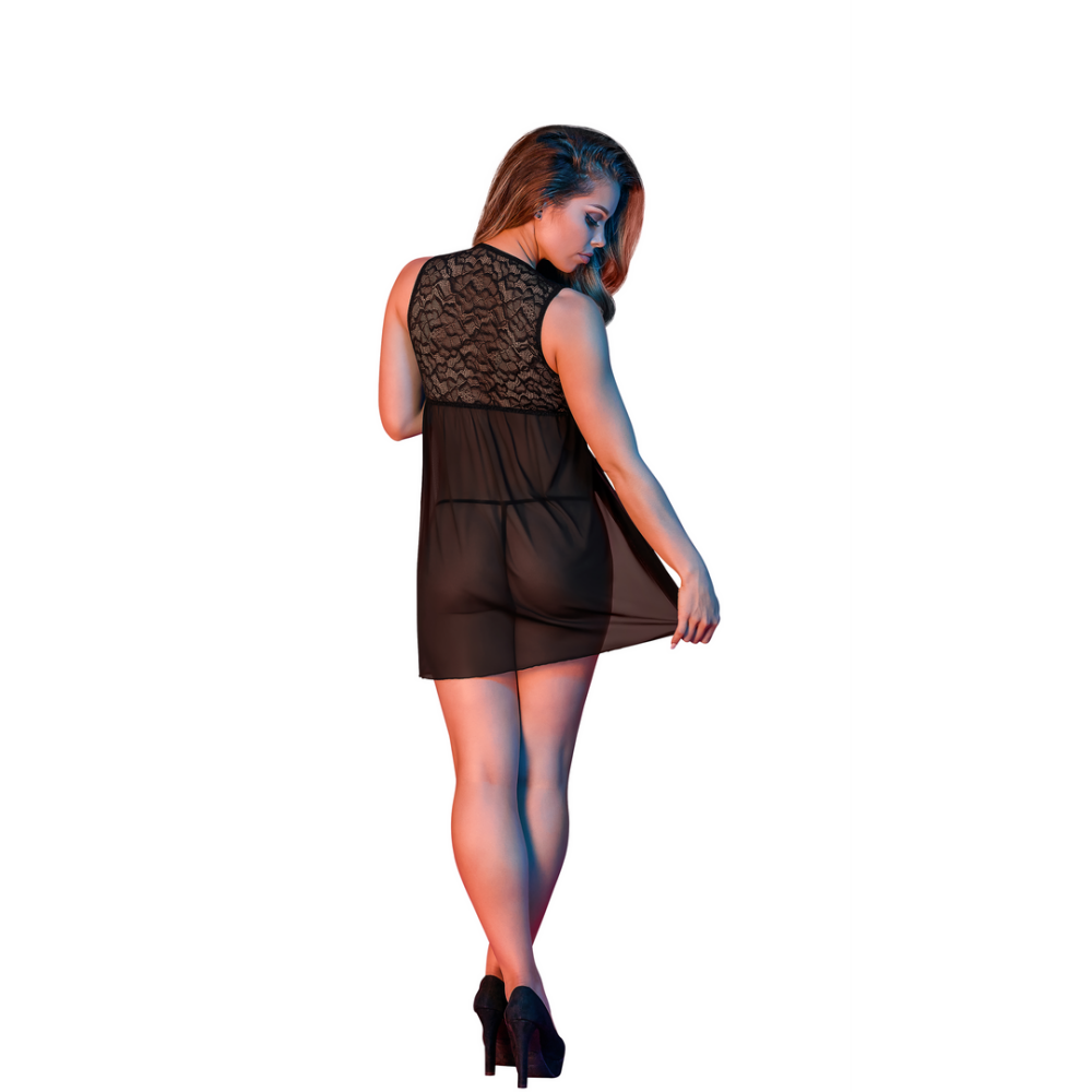 Van de Exposed by Magic Silk-collectie, deze stijl omvat: Een babydoll met zachte kant bh-cups, een tank-stijl kant achterkant, een open voorkant die wegvalt, lange dekking tot boven de dijen, en een klassieke mesh g-string.