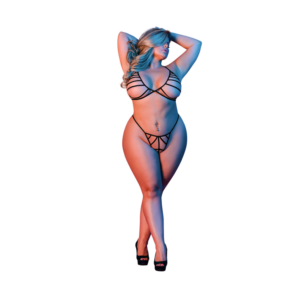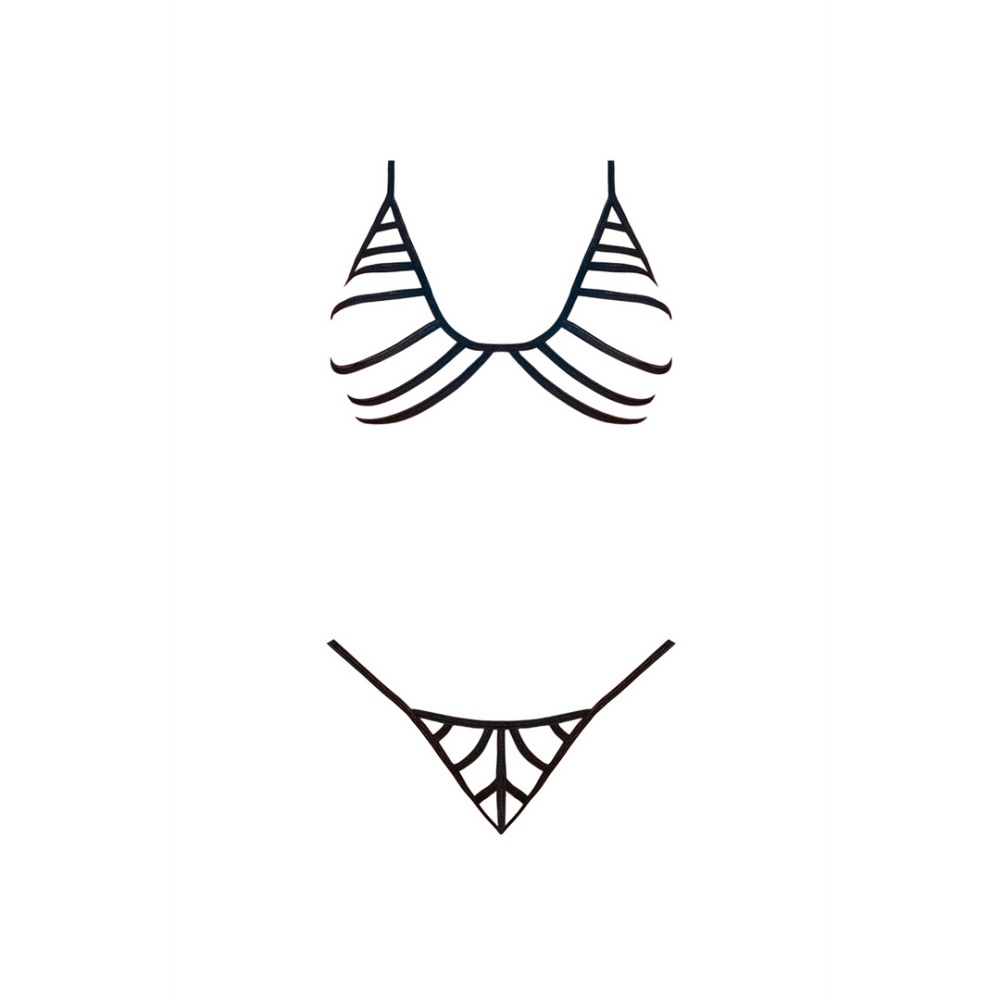 Van de Exposed by Magic Silk-collectie, deze stijl omvat: Een halterbh met bandjes, voorzien van zachte, vormbehoudende elastiek en strikjes rond de nek en rug voor sluiting, en een bijpassende string met bandjes.