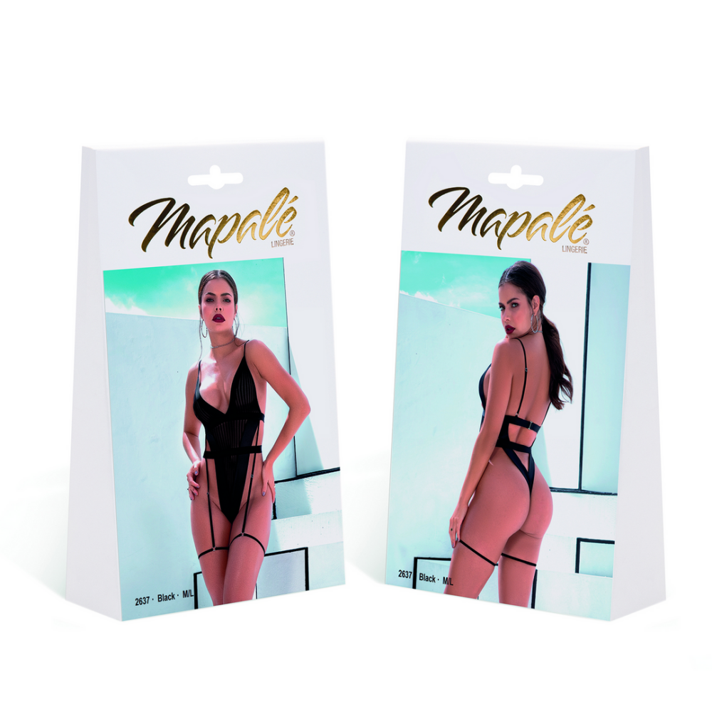 Dit is werkelijk een versterkend stuk van verfijnd ontwerp. Gestreepte mesh bodysuit met nep leren accenten, een gecinchde taille, verstelbare bandjes en een metalen Z-haak, haak-en-oog sluiting in het kruis en bevestigde kousen slip-cut onderkant.