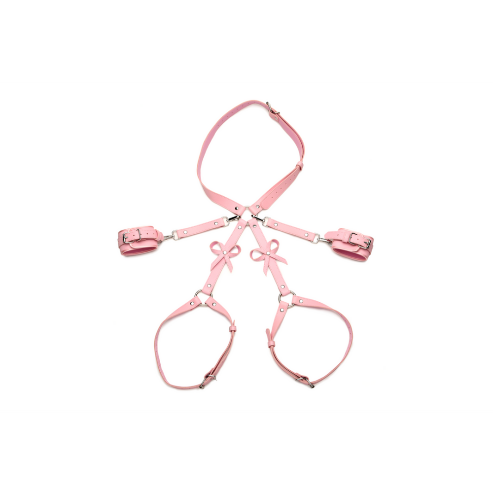 Het gebruik van je lichaam is een cadeau behandel het als zodanig met dit bondage harnas en wikkel je taille, dijen en polsen als een mooi, klein pakketje – het heeft zelfs strikjes inbegrepen! Gemaakt van roze, duurzaam PU nepleer, is het veganistisch vriendelijk en gemakkelijk te reinigen of af te vegen na elk gebruik. De polsbandjes sluiten met nikkelvrije, zilverkleurige metalen gespen. Pas de gespen aan op de dijbanden, tailleband en polsbandjes voor een op maat gemaakte en comfortabele pasvorm. Benadruk je rondingen en laat je partner watertanden van lust en verlangen terwijl je jezelf presenteert als het object van hun bewondering, een gebonden en onderdanige speelpartner die klaar is om de nacht op te fleuren! Bevestig jezelf of, nog beter, laat je partner je beperkingen opleggen! Terwijl elke gesp een band strakker trekt, geniet van het gevoel gebonden te zijn. Zelfs symbolisch kan je geest beginnen te verschuiven naar onderdanigheid en ontvankelijkheid voor geweldige, heerlijke en afwijkende ideeën die jullie samen kunnen verkennen! Zorg ervoor dat het niet te strak is, zodat het je bloedstroom niet belemmert. Met je polsen achter je rug getrokken door de banden, kniel voor je partner terwijl zij de rol van Mister, Mistress, Dominant of zelfs Daddy spelen! Voeg je favoriete speeltjes toe en ga verder met voorspel om deze scène echt rijk en sensueel te maken! Na gebruik, reinig elk deel van het harnas dat aandacht nodig heeft met een zachte doek en speelgoedreiniger. Afmetingen: Taille past van 66 cm tot 107 cm omtrek. Dijbenen passen van 33 cm tot 66 cm omtrek. Polsbandjes passen van 14,5 cm tot 26 cm omtrek. Materialen: PU leer, metaal Kleur: Roze, zilver Belangrijkste Kenmerken: Mooie Bondage: Geniet van hoe dit harnas je taille, dijen en polsen beperkt met banden en polsbandjes. Toegevoegd aan het ontwerp zijn kleine strikjes die de achterkant van je dijen accentueren! PU Leer: Gemaakt van veganistisch vriendelijk, duurzaam PU nepleer. Reinigen indien nodig. Verstelbare Gespen: Alle banden zijn verstelbaar via de gespen en gaten. Nikkelvrij Metaal: Het gebruikte metaal is nikkelvrij en lichaamsveilig.