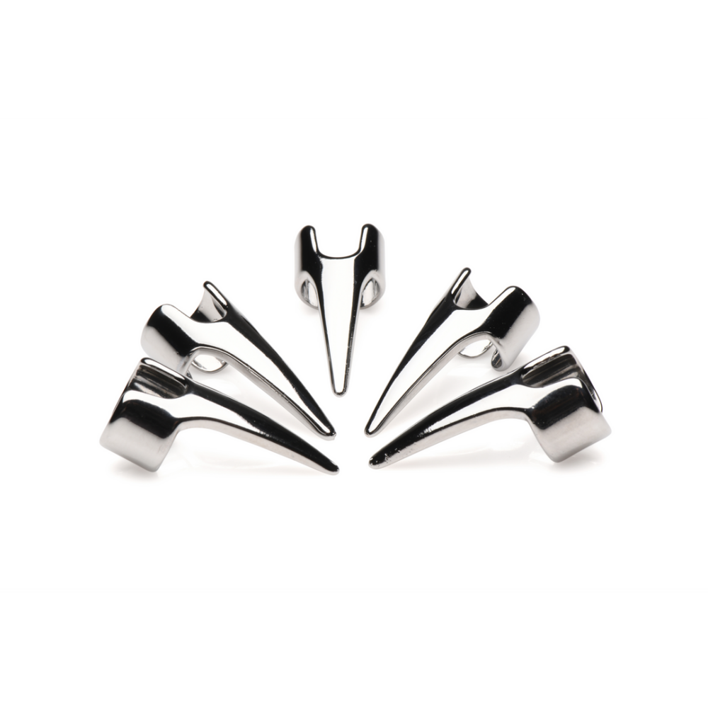 Graaf in genot met deze 5-delige Claw Ring set! Het stevige, roestvrijstalen materiaal geeft je lange klauwen aan één hand om je partner mee te krabben, te strelen, te klauwen en te stimuleren! Deze set heeft verstelbare ringen voor een comfortabele en veilige pasvorm voor iedereen. Het roestvrijstaal is nikkelvrij voor gevoelige huid en ook niet-poreus, waardoor het gemakkelijk schoon te maken is en met elk type glijmiddel kan worden gebruikt. Heb wat plezier met e-stim en combineer het met een body adapter elektro-stimulatieplaat! Laat je vingers over je geliefde glijden en schok ze met een enkele aanraking terwijl je lichaam geleidend wordt en de stroom door je heen loopt! Deze ringen zijn perfecte aanvullingen voor elke kinky scène en voegen echt iets toe aan sensatie spel! Om schoon te maken, kook je het staal in heet water of was je ze eenvoudig met warm water en milde zeep voordat je ze besproeit met een speelgoedreiniger. Schuif elke ring om je vingers en pas ze aan voor de juiste strakheid. Ze transformeren je hand in de hand van een beest met klauwen! De sinistere klauwen voegen iets toe aan je uitstraling en versterken je aanraking. Terwijl je ze lichtjes over het lichaam van je partner sleept, krijgt hun huid kippenvel bij elke lichte streling. Wanneer je bij het vlees van hun dij komt, graaf je erin en druk je de ronde punten in hun huid en spieren. Een kreun ontsnapt hun lippen en je leunt naar voren om hun nek te bijten, wat de intensiteit verhoogt! Je laat ze los en schakelt dan de elektro-stimulatie in. Elke aanraking schokt ze nu en ze lachen en schreeuwen van genot en pijn! Je blijft ze als een instrument bespelen tot diep in de nacht!