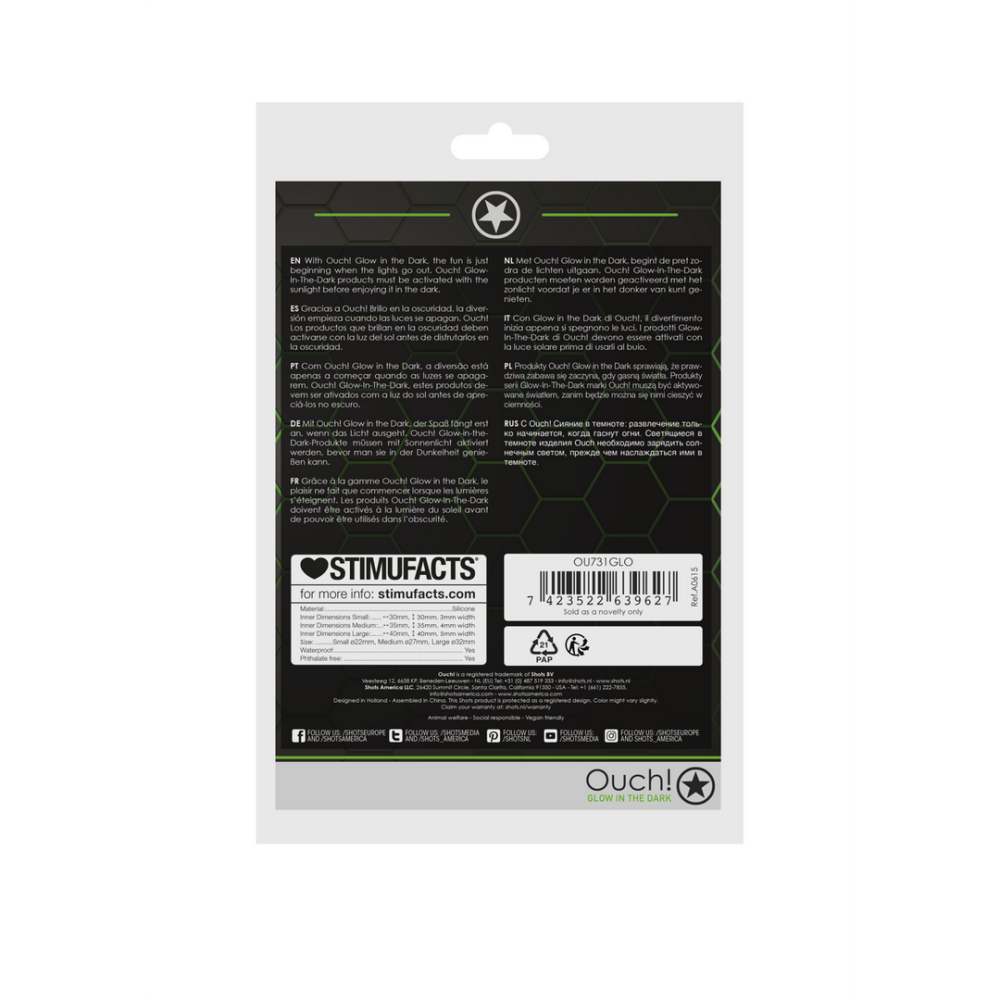 Ouch! Glow in the Dark, de toekomst van bondage is hier. Het design heeft het autentiek bondage uiterlijk, maar brengt licht in het duister door zijn fluoresecrende groene details waardoor alles een feest wordt. Deze penisring bevat twee ringen die comfortabel en rekbaar zijn. De ringen verbeteren je seksuele daden en brengen vele mogelijkheden met zich mee door de flexibiliteit. Ouch! Glow-In-The-Dark producten moeten worden geactiveerd met het zonlicht voordat je er in het donker van kunt genieten.