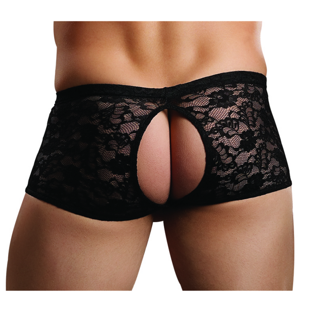 Van de Stretch Lace-collectie van Male Power, deze stijl omvat: Een kanten short met een kruisloze voorkant en een peek-a-boo uitsnijding aan de achterkant.
