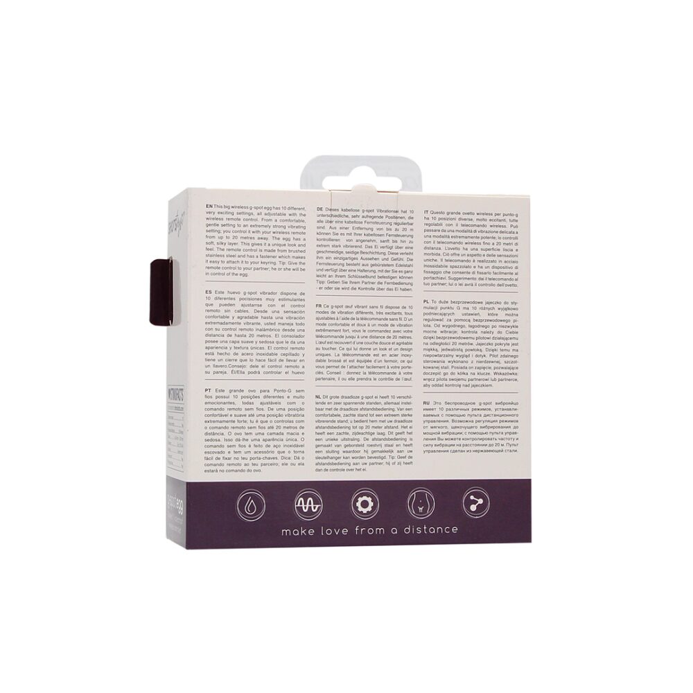 Dit grote draadloze g-spot ei heeft 10 verschillende en zeer spannende standen, allemaal instelbaar met de draadloze afstandsbediening. Van een comfortabele, zachte stand tot een extreem sterke vibrerende stand u bedient hem met uw draadloze afstandsbediening tot op 20 meter afstand. Het ei heeft een zachte, zijdeachtige laag. Dit geeft het een unieke uitstraling. De afstandsbediening is gemaakt van geborsteld roestvrij staal en heeft een sluiting waardoor hij gemakkelijk aan uw sleutelhanger kan worden bevestigd. Tip: Geef de afstandsbediening aan uw partner hij of zij heeft dan de controle over het ei.