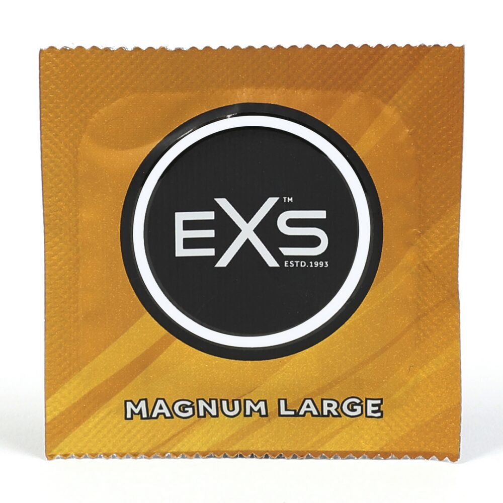 Glad, effen, natuurlijk latex, wijd uitlopende speen en condoom met siliconenglijmiddelAls je een groter condoom nodig hebt, dan is EXS Magnum degene voor jou. Ze hebben een breedte van 60 mm en een uitlopend speenuiteinde voor extra comfort. EXS Magnum heeft geen latexgeur en is gemaakt van een dunne maar sterke zijdeachtige latex. Krachtig getest volgens de Europese normen en door het British Standards Institute (BSI) Dit product is extreem dun maar heeft de sterkte van dikkere reguliere latexcondooms.