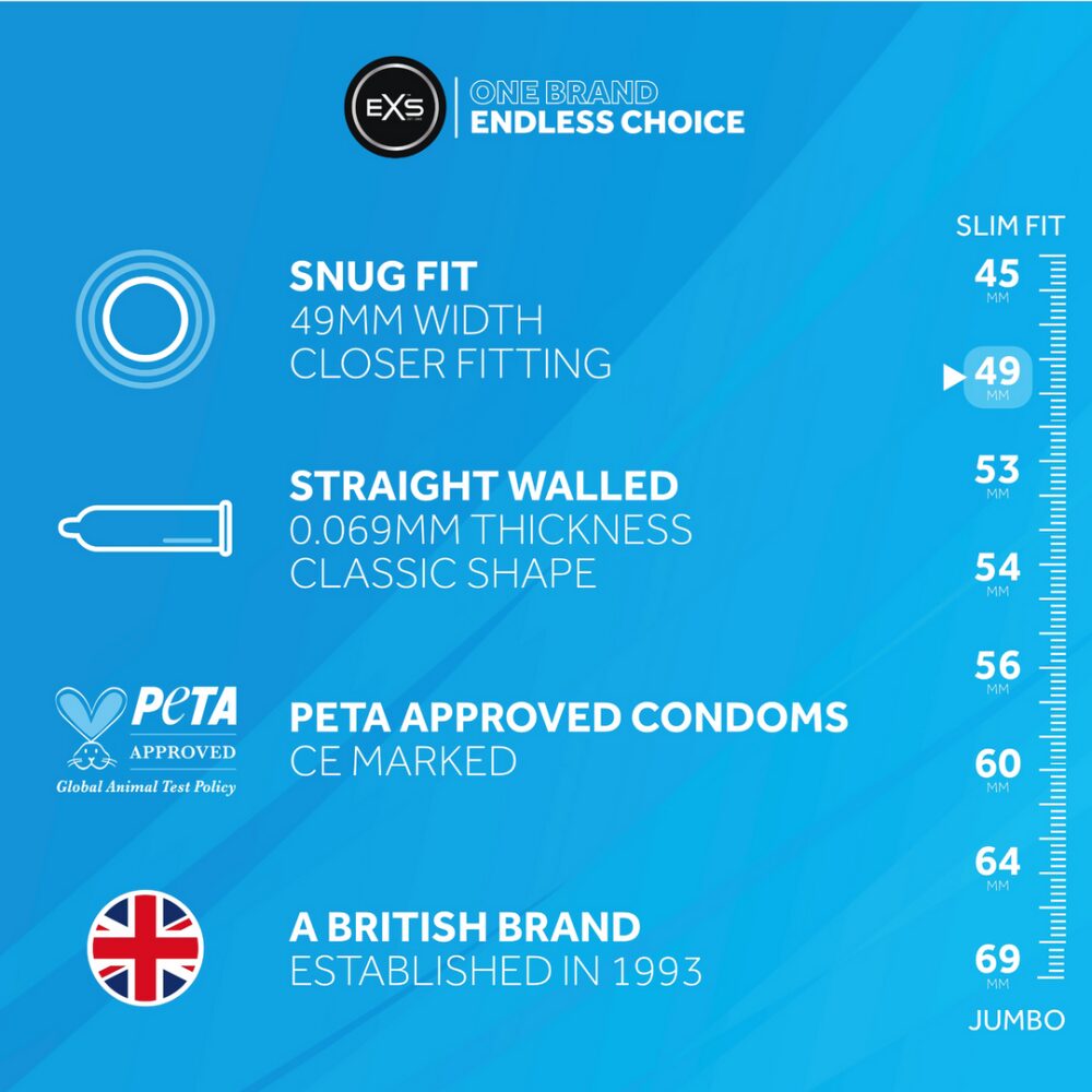 Kies EXS Snug Fit voor een strakker en steviger passend condoom. Ze zijn 49 mm breed en hebben een rechte wand en een speenuiteinde. EXS Snug Fit condooms hebben geen latexgeur en zijn gemaakt van een dunne maar sterke zijdeachtige latex. Krachtig getest volgens de Europese normen en door het British Standards Institute (BSI) Dit product is extreem dun maar heeft de sterkte van dikkere reguliere latexcondooms.