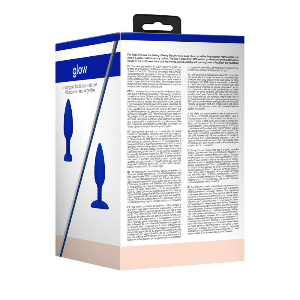 For those who love the feeling of being filled, the Glow large vibrating and heating magnetic rechargeable butt plug is a perfect addition to any toy box. The Glow is made from 100% medical grade silicone and has stimulation ridges on the shaft to enhance your experience. Glow is available in 3 stunning colours: Red, Black and Royal Blue! This new generation F1 super powerful motor vibrates at a staggering 11,000 rpm. It features 10 unique vibration functions. This anal toy comes with a “heat function that lets you warm up the toy to a gorgeous 42 degrees Celsius (107.6 Fahrenheit). The Glow is CE Certified, waterproof (IP67), extremely quiet and it contains a rechargeable battery that when fully charged with its magnetic USB cable will provide 60 minutes of passionate playtime. Just click and charge!