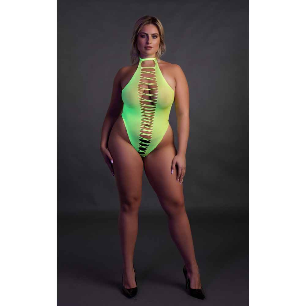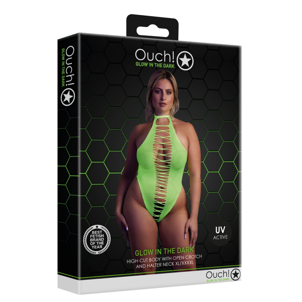 Our Neon lingerie is the perfect addition to your collection. Made with comfortable, easytofit, stretchy materials they are designed to fit your body perfectly. Whether you’re using them as party wear or as lingerie, this eye-catching piece will make sure you stand out! Unleash your inner goddess with this stunning UV activated lingerie. This gorgeous body has a show stopping easy to tie halterneck and a high cut creating the illusion of a smaller waist and rounder hips. The open croutch gives it a little extra playfulness. An amazing party-wear that gives you that wow-factor and makes you stand out. The UV activated materials adds a touch of mystery and allure. Easy to fit because of the stretchy materials will make you light up the night. Available in neon pink and neon green. Sizes run from XS/ XL to XL/XXXXL