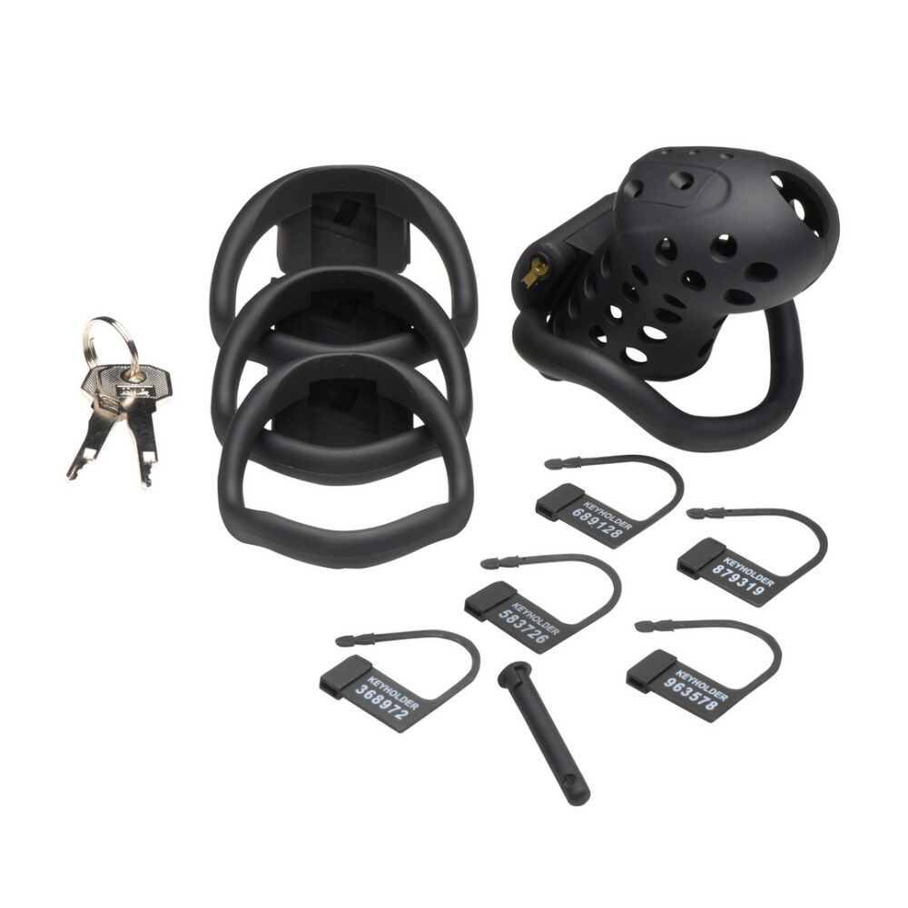 Explore new realms of submission and control with the Lock Down Chastity Cage. The cum-thru tip lets you maintain bathroom convenience, even during extended wear. Thanks to the breathable design, evenly spaced holes ensure your comfort by keeping everything ventilated. Customize your experience with four ring sizes, designed to give you the perfect fit around the base of your shaft. Enjoy secure confinement with two locking mechanisms: a pin and a key that only the Keyholder can operate. This comprehensive kit also includes an internal lock, 2 keys for additional peace of mind, a locking pin, and 5 keyholder tags that ensure that the Keyholder can tell if their naughty caged submissive breaks their chastity. Discover a new level of intimate play today! The cage slips onto a lubed, flaccid shaft. The pin is placed into the ring, the key locking it all in place. The Keyholder hangs the key around their neck. As you gaze up at them, you see the glint of the metal shining in the dim light, reminding you of their dominance over you. Suddenly, all you can think about is getting out of the cage, but you’ll do anything for them to get that privilege. They become your sole focus, pleasing them and making them think you are worthy of release. Measurements: Cage is approximately 3 inches Length x 2 inches Width. Ring inner diameters: 1.9 inches, 2.1 inches, 2.2 inches, 2.3 inches.