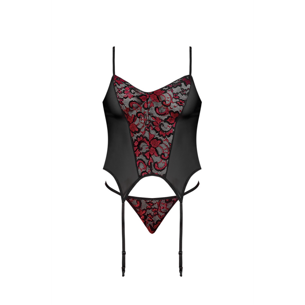 Van de Exposed by Magic Silk-collectie, deze stijl omvat: Een merry widow met verstelbare schouderbanden met metalen sliders en bevestigde kousenbanden met metalen clips, en een bijpassende kanten G-string.