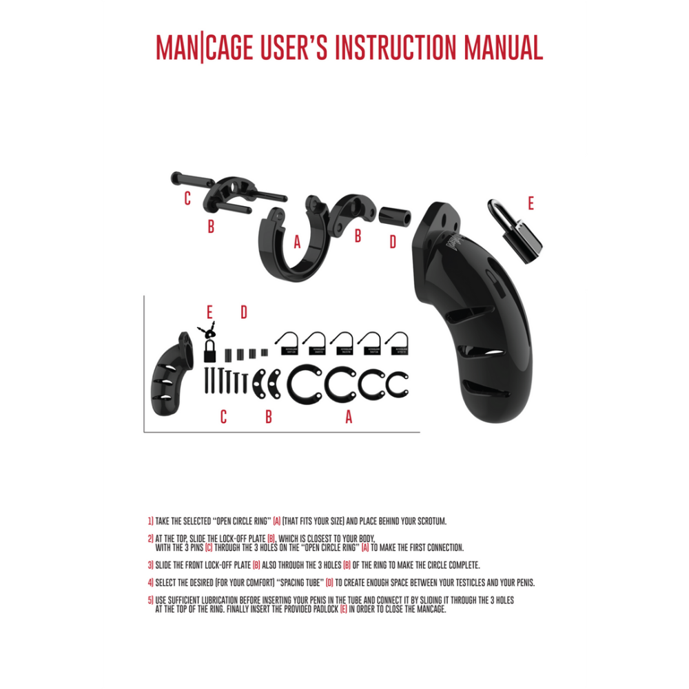 BRENG JE BDSM-SPEL NAAR EEN TOTAAL NIEUW LEVEL! CONTROLEER OF WORDT GECONTROLEERD, DAT IS DE VRAAG!De Man|Cage Chastity Cages zijn gemaakt van polycarbonaat van hoge kwaliteit, en dat is een zeer licht, duurzaam en hypoallergeen materiaal. De kooi bestaat uit drie delen die perfect op elkaar aansluiten. De twee geleide pennen sluiten de bovendelen aan, en de ovale borgpen sluit de ringen op de kooi aan. Dankzij verscheidene ringen in verschillende maten en opvullers kunt u de perfecte maat creëren. De ringen zitten comfortabel en zijn gegarandeerd veilig. Met een metalen slotje of kabelbinder kunt u de kooi makkelijk vergrendelen. De meegeleverde snelbinders zorgen ervoor dat het alarm op feesten, festivals en zelfs luchthavens niet afgaat. De superieure Man|Cage-serie is uitgerust met veschillende ventilatiekanalen en een opening om te urineren omdat hygiëne erg belangrijk is tijdens het dragen. Door de kooi is het onmogelijk om een erectie te krijgen, maar deze zal na het bevrijden super intens zijn, net als het bevrijdende orgasme dat volgt. Dankzij Man|Cage Chastity Cage geeft de houder van de sleutel ongekende macht over de seksuele bevrediging.