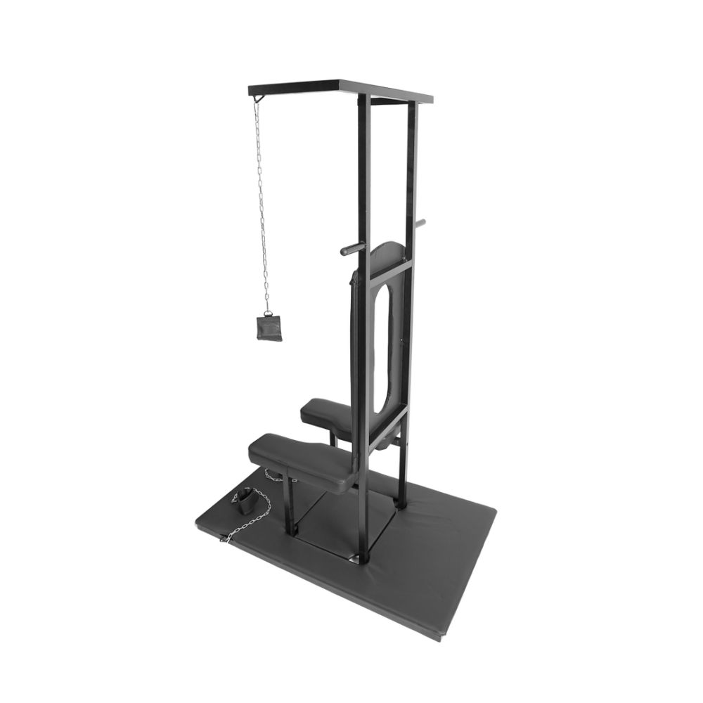 Geef je seksleven een extra boost met deze multifunctionele Love Chair die in geen enkele BDSM-collectie mag ontbreken!Laat je fantasie de vrije loop bij alle mogelijkheden die deze stoel te bieden heeft, zoals posities die voorheen misschien moeilijk uit te voeren waren of die in de loop van de tijd oncomfortabel werden.De Love Chair wordt geleverd met een uiterst stevig onderstel waarop een hoogwaardig stalen frame is gemonteerd. De met dik schuimrubber gevoerde beensteunen en open rugleuning zijn bekleed met duurzaam, gemakkelijk schoon te maken PU-leer. De Love Chair wordt geleverd met roestvrijstalen kettingen, inclusief afneembare hand- en enkelboeien, die beide zijn voorzien van klittenband.Creëer je eigen intieme fantasiewereld en laat jezelf helemaal gaan!De Love Chair is 183 cm hoog, 76 cm breed en 120 cm lang.