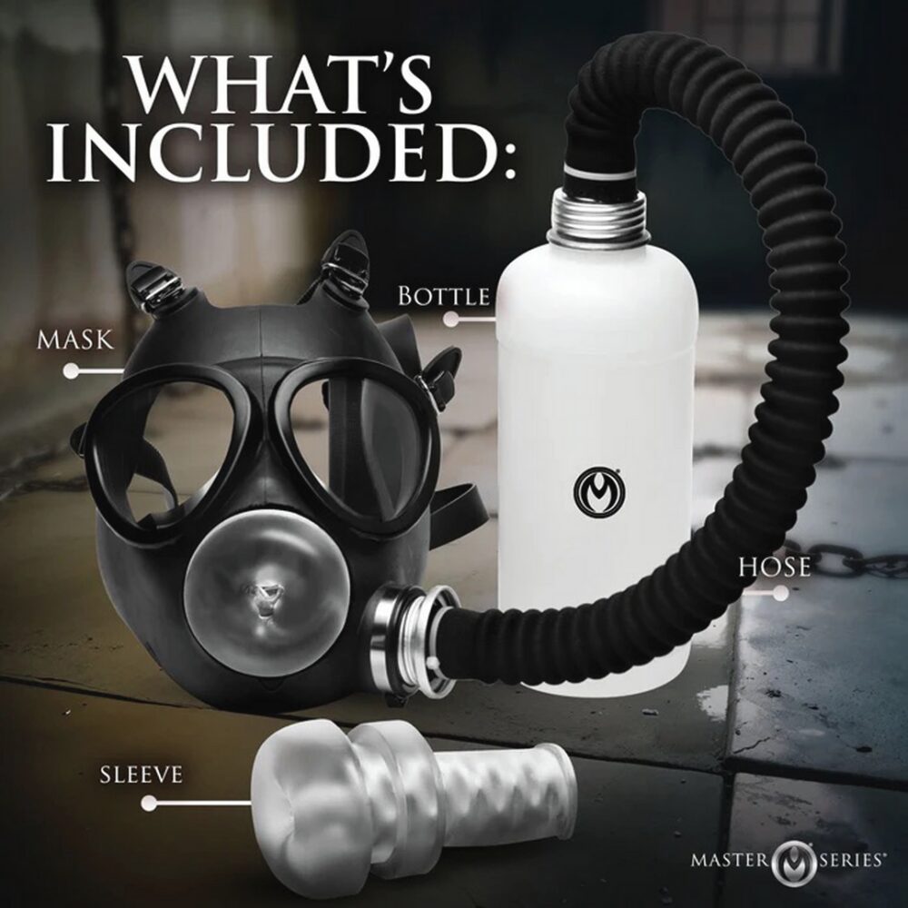 Introducing the Overload Stroker Gas Mask Kit for breath play enthusiasts. With an integrated one-way breathing valve, it provides an exquisite blend of airflow and aroma while ensuring each exhale expels carbon dioxide effectively. The 20-inch hose links to an aroma bottle that can be filled with enticing liquids to enhance restriction. Its unique masturbator sleeve adds an erotic twist, allowing your partner to engage in oral pleasure as you breathe through the mask. Adjustable silicone head straps guarantee a snug and custom fit, offering an immersive experience. Measurements: Hose: 20.2 inches length, 40mm thread. Bottle holds up to 1L of liquid. Sleeve depth: 4.2 inches. Materials: Mask: Silicone, aluminum, polycarbonate. Hose: Rubber, aluminum, fabric. Bottle: Plastic. Sleeve: Rubber. Color: Black, clear. Note: Use only with water-based lubricants.