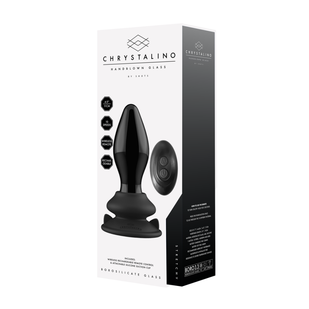 Of je het nu alleen gebruikt of met de meegeleverde verwijderbare siliconen zuignap, je slaapkamerspel zal nieuwe hoogten bereiken met de Chrystalino-glasvibrators van Shots.Deze krachtige Chystalino vibrator van glas met 10 snelheden is gemaakt van hoogwaardig niet-poreus zwart borosilicaatglas dat lichaamsveilig, onbreekbaar en duurzaam is.Ze zijn perfect voor temperatuurspelletjes, je kunt het opwarmen in warm water of afkoelen in de koelkast voor extra stimulatie.De sterke siliconen cupbasis van medische kwaliteit kan op bijna elk vlak oppervlak worden aangebracht voor een sterke, veilige grip en kan ook worden gebruikt met uw favoriete O-Ring Strapon.Met de meegeleverde draadloze afstandsbediening heb je de bediening binnen handbereik – of nog beter, in de handen van je partner! Switch door 10 unieke vibratiepatronen voor echt intense, adembenemende orgasmes!Houd de aan/uit-knop op de vibrator of draadloze afstandsbediening 3 seconden ingedrukt om in te schakelen. Druk op de aan/uit-knop om door de 7 niveaus en 3 trillingssnelheden te switchen. Om uit te schakelen, houdt u de aan/uit-knop 3 seconden ingedrukt.Let op: voorzichtig gebruiken. Glazen pluggen kunnen erg glad zijn als ze nat zijn of glijmiddel op zich hebben. Als het op een stenen of betegelde vloer valt, kan het glas afbrokkelen of breken. Inspecteer de plug altijd goed voor gebruik en stop het gebruik onmiddellijk als deze beschadigd is.