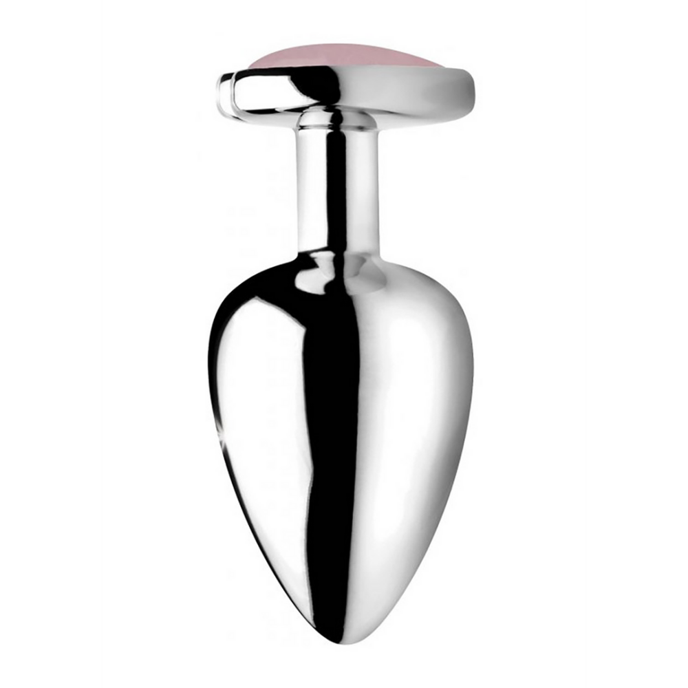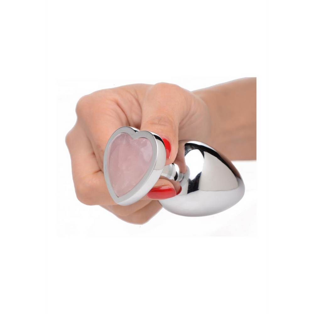 The romantic Heart-Shaped Rose Quartz Gem found on the base of this butt plug opens your romantic energy so you can more easily love yourself or your lover! The smooth and weighty texture provides a deeply satisfying mass of hardness for your butt to squeeze on, perfect for use on your own or as a warmup toy for further anal fun with a lover. Constructed with a body safe aluminum alloy that is easy to clean and compatible with most lubes so you can play with your favorite slippery stuff. Measurements: Overall length 3.7 inches, insertable length 3.2 inches, diameter at widest point 1.6 inches Materials: Aluminum alloy, Rose Quartz Color: Pink, metal Key Features: Genuine Heart-Shaped Rose Quartz Gem: Purify and open your heart the alluring pink Rose Quartz promotes romance and encourages self love for more fulfilling personal time Comfortably Weighted: Add a downward pull to your hole for additional stimulation and pleasure thanks to the weighty nature of these metallic butt plugs Nickel Free Aluminum Alloy: The aluminum alloy material provides a deliciously hard and smooth mass for your ass to squeeze compatible with most lubes Great For Temperature Play: Warm or chill this gemstone butt plug in a bowl of water to add another layer of sensation while you play perfect for veteran butt plug users looking for a new way to play
