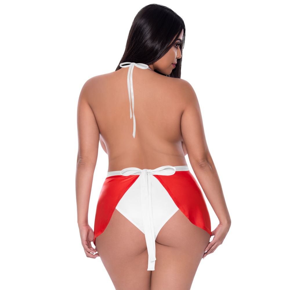 Van de Dress Up-collectie van Magic Silk, deze stijl omvat: een rode en witte jurk met een open rug, striksluitingen aan de voorkant en lage rug, een bijpassende witte slip en een bijpassende witte en rode haarband.