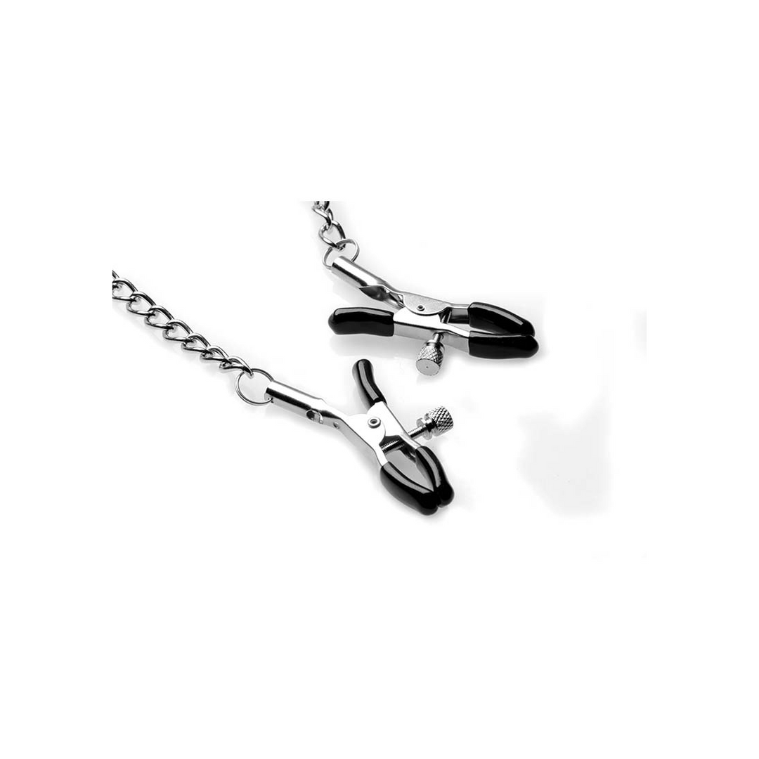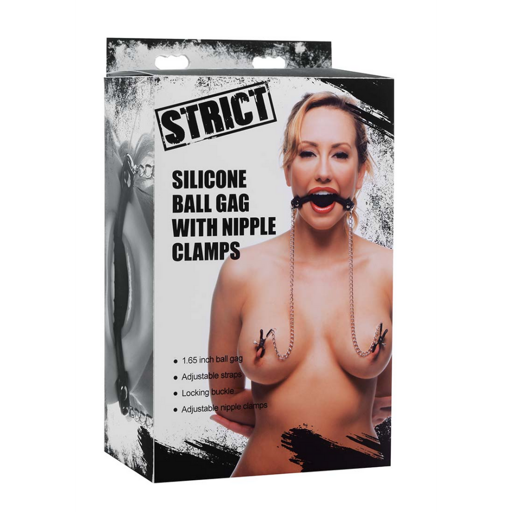 Verander de sfeer in je slaapkamer met slechts één speeltje! Dit 2-in-1 BDSM-apparaat zal ervoor zorgen dat je geliefde zich gedraagt als de goede onderdanige die je verlangt. Vul hun mond met een siliconen balgag, waardoor ze niet meer kunnen spreken en zich hulpeloos sexy voelen. Je slaaf zal het geweldig vinden om te weten dat jij volledig de controle hebt wanneer je de achterkant aanpast naar hun perfecte maat en ze vastzet met de vergrendelbare gesp. De tepelklemmen die aan de gag hangen zijn ook verstelbaar, waardoor je de optie hebt om je speelmaatje te plagen met een lichte druk, of hun masochisme te bevredigen met een stevige knijp! Geniet van de gedempte geluiden van hun genot en pijn door deze unieke gag. Afmetingen: De band past van 40 tot 57 cm in omtrek. De diameter van de bal is 4,2 cm. Elke ketting meet 35 cm in lengte. Materiaal: Siliconen, PU-leer, metaal. Kleur: Zwart. Opmerking: Slot en 2 sleutels inbegrepen.