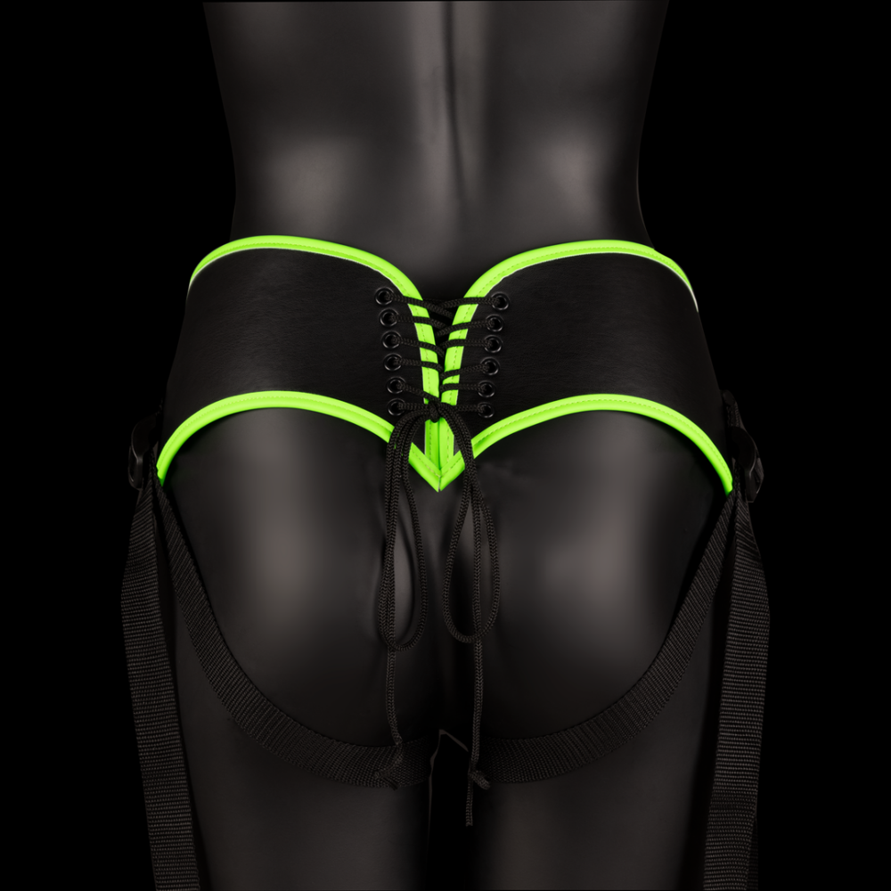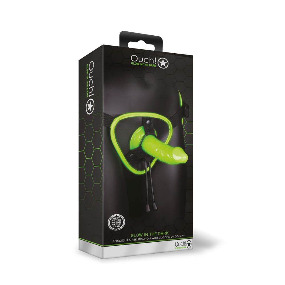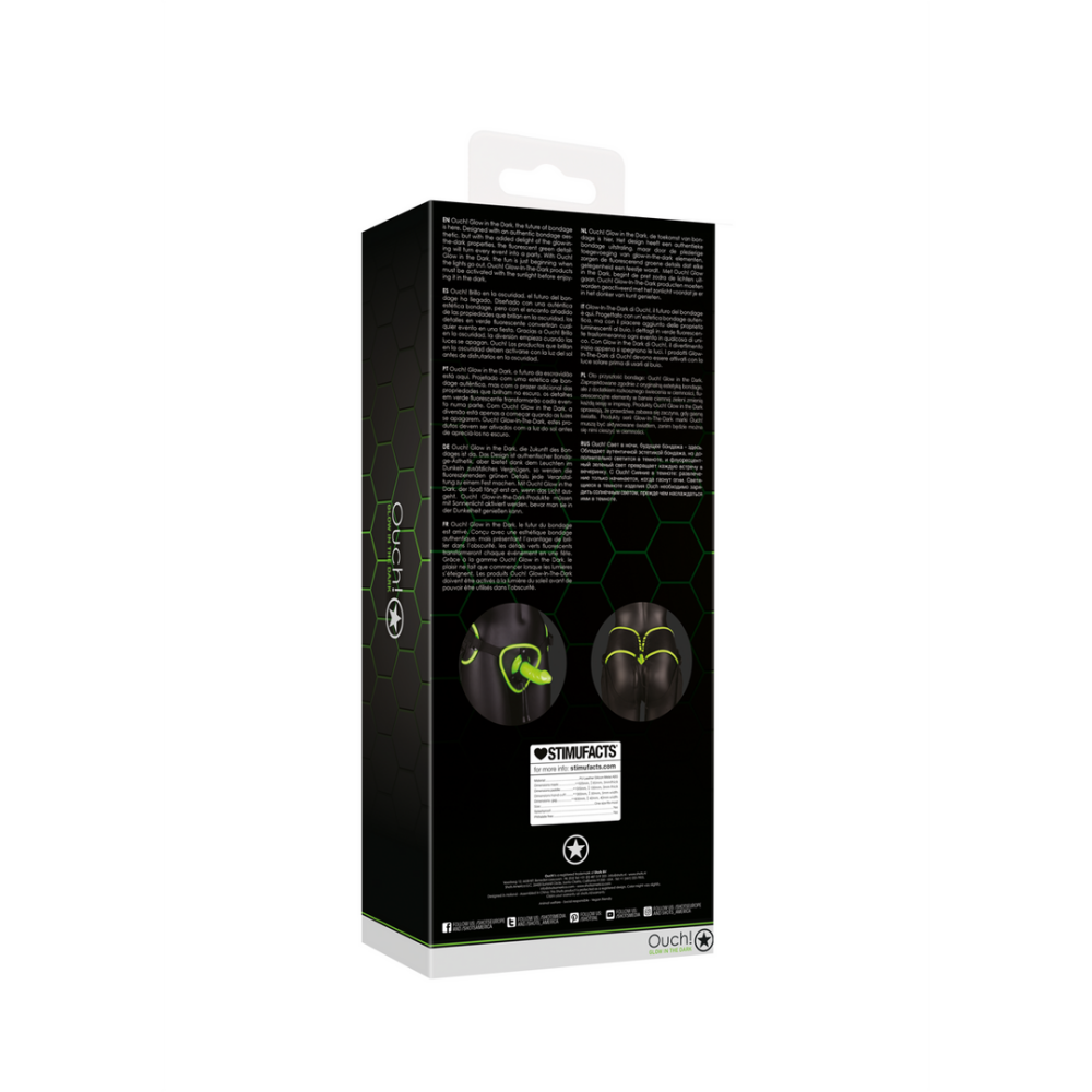 Ouch! Glow in the Dark, de toekomst van bondage is hier. Het design heeft het autentiek bondage uiterlijk, maar brengt licht in het duister door zijn fluoresecrende groene details waardoor alles een feest wordt.   Wees brutaal met deze strap-on! De strap-on is elastisch and verstelbaar waardoor het op elk lichaam past. Durf anders te zijn met deze silicone dildo. Ouch! Glow-In-The-Dark producten moeten worden geactiveerd met het zonlicht voordat je er in het donker van kunt genieten.
