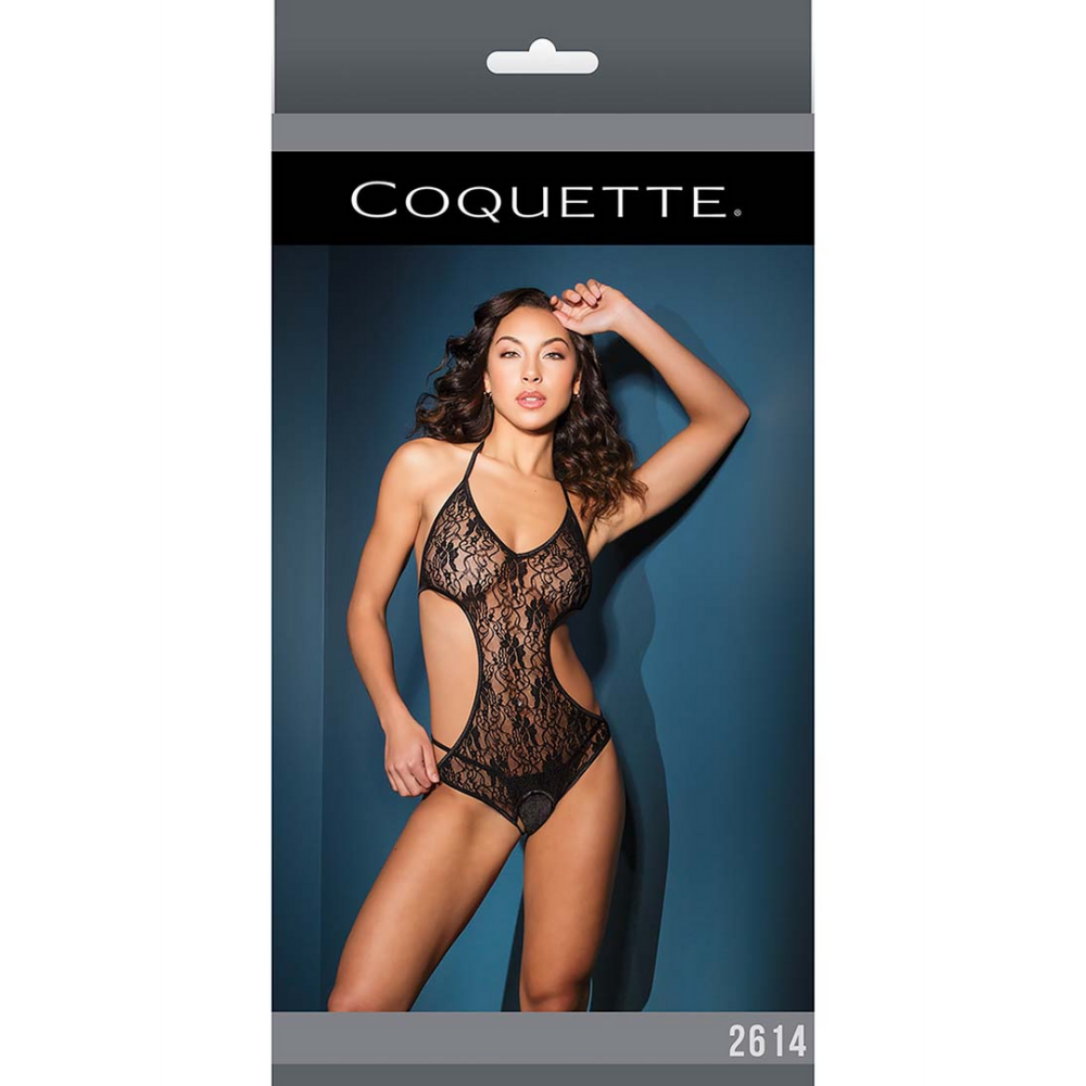 Lace halter teddy, crotchless and backless. Made of stretchy lace.*G-String not included