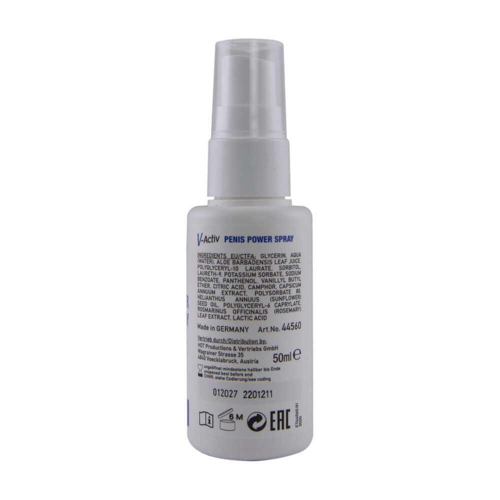 HOT V-ACTIV PENIS POWER Spray Penis Power Spray Men is van hoge kwaliteit, speciaal voor erotisch genot. Wanneer het dagelijks wordt aangebracht, kan het een positieve invloed hebben op uw vitaliteit en welzijn. Onderscheidt zich door zijn bijzondere combinatie van stimulerende bloedsomloop en verzorgende ingrediënten. Het voordeel van sprays is hun snelle en gemakkelijke toepassing. Bevat natuurlijk ginkgo-extract.