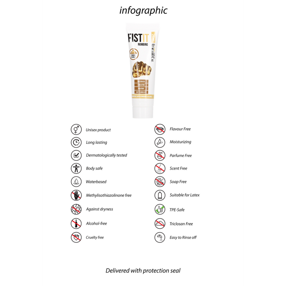 Fist It Numb is a water-based lubricant. Suitable for use with latex condoms. Dermatologically tested, fat-free. Directions for use: Apply as much gel as you want on the body part that you want and repeat as often as you like. Keep out of reach of children. Store in a cool, dark place.