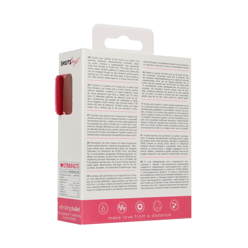 Bedien je partner met één druk op de knop! Dit perfect ontworpen, vibrerende bullet kan je besturen met een draadloze afstandsbediening en is uitgerust met een superkrachtige motor van de nieuwe generatie die vibreert met een toerental van 16.000 rpm. De motor heeft 10 verschillende, unieke vibratiepatronen van golven en pulsaties, die veranderd kunnen worden met de handige, draadloze bediening die werkt tot op een afstand van 20 meter. De bullet is omhuld met een zijdezachte, gladde laag die het een uniek uitzicht en gevoel geeft.