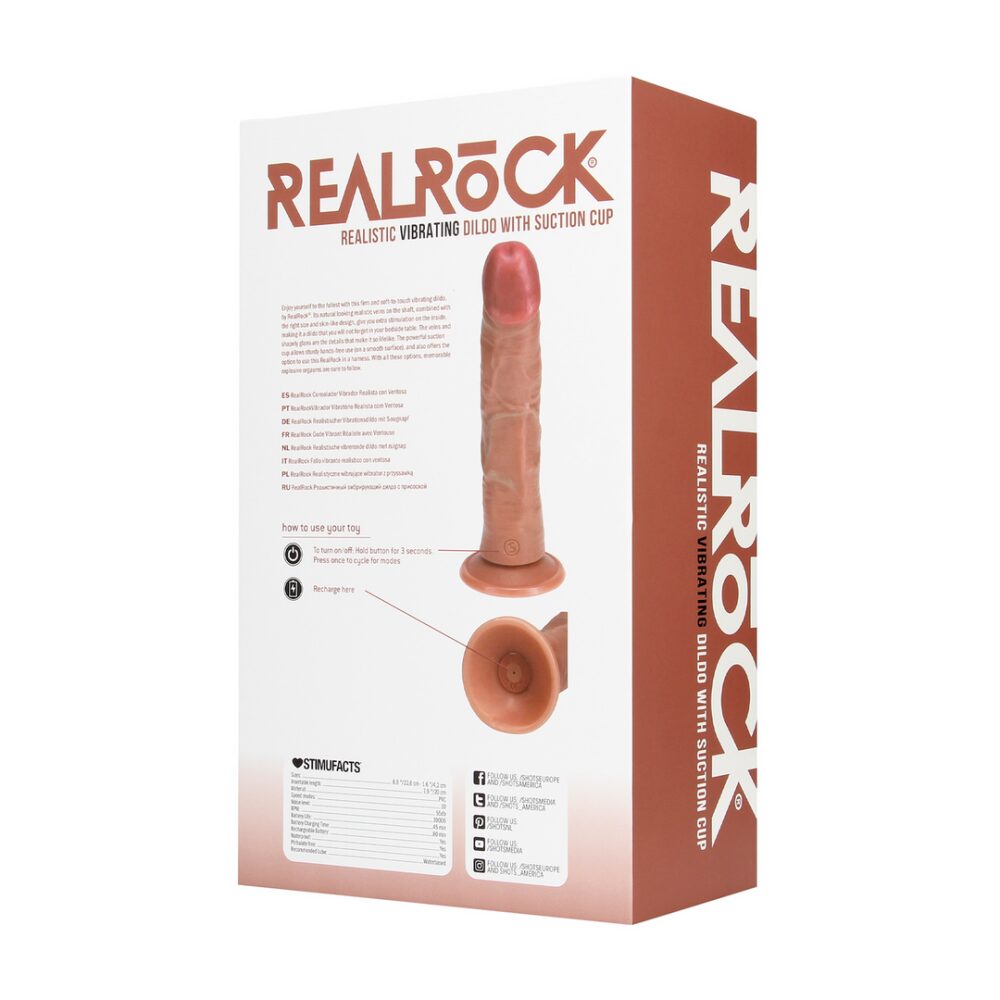 Geniet ten volle met deze stevige en zacht aanvoelende vibrerende dildo van RealRock®. De natuurlijk ogende realistische aderen op de schacht, gecombineerd met de juiste maat en huidachtige vormgeving, bieden extra stimulatie van binnen, waardoor het een dildo is die je niet zult vergeten in je nachtkastje. De aderen en de gevormde glans zijn de details die het zo levensecht maken. De krachtige zuignap zorgt voor stevig handsfree gebruik (op een gladde ondergrond) en biedt ook de mogelijkheid om deze RealRock in een harnas te gebruiken. Met al deze opties zijn memorabele explosieve orgasmes gegarandeerd.