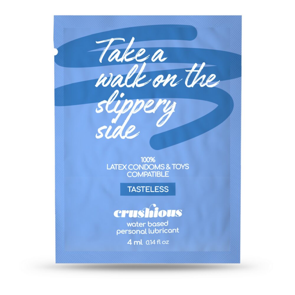 Crushious glijmiddelen zijn gemaakt met eersteklas ingrediënten en zorgen voor een huidvriendelijke en hypoallergene ervaring.Crushious glijmiddelen op waterbasis zijn latex condooms veilig en compatibel met alle seksspeeltjes.Ze zijn bedoeld om een langdurige, optimale vochtigheid te bieden tijdens geslachtsgemeenschap of solospel.Verbeter je penetrerende ervaringen met een natuurlijk en langdurig glijmiddel.Dit zakje is bestemd voor éénmalig gebruik.Hoe te gebruiken:Breng een kleine hoeveelheid aan op het gewenste gebied. Herhaal dit naar wens. Afspoelen met water.Belangrijkste kenmerken:- Perfect om het product te presenteren- Langdurige sensatie- Unisex- Niet vet- Dermatologisch en klinisch getest- Compatibel met latex condooms- Geeft geen vlekken- Compatibel met seksspeeltjes- In water oplosbaar- Made in EUCaution: Allergieën komen niet vaak voor, maar kunnen voorkomen. Breng voor regelmatig gebruik een kleine hoeveelheid aan op je onderarm. Als er een allergische reactie optreedt, stop dan met het gebruik.Buiten bereik van kinderen bewaren.Niet gebruiken op beschadigde of gescheurde huid.Hoeveelheid:4 ml.